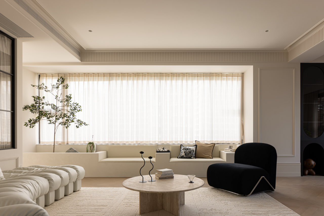 A large window at the end of the living room lets in plenty of natural light. The storage is hidden throughout the department and the lighting is embedded in several areas to avoid visual clutter. Bright glows of color and cured textual elements add interest to the minimalist design.