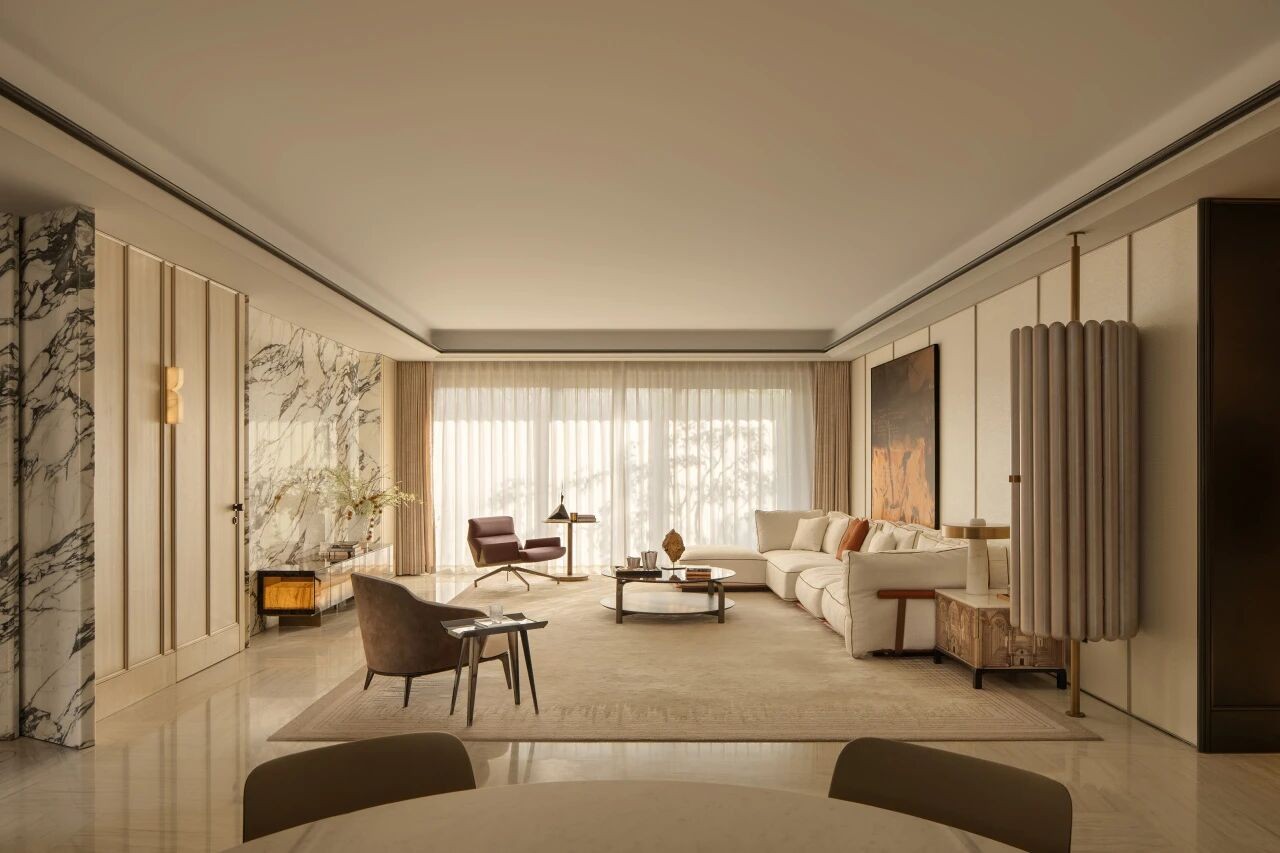 左侧的竖型灯带与嵌入式的黑色线型扶手