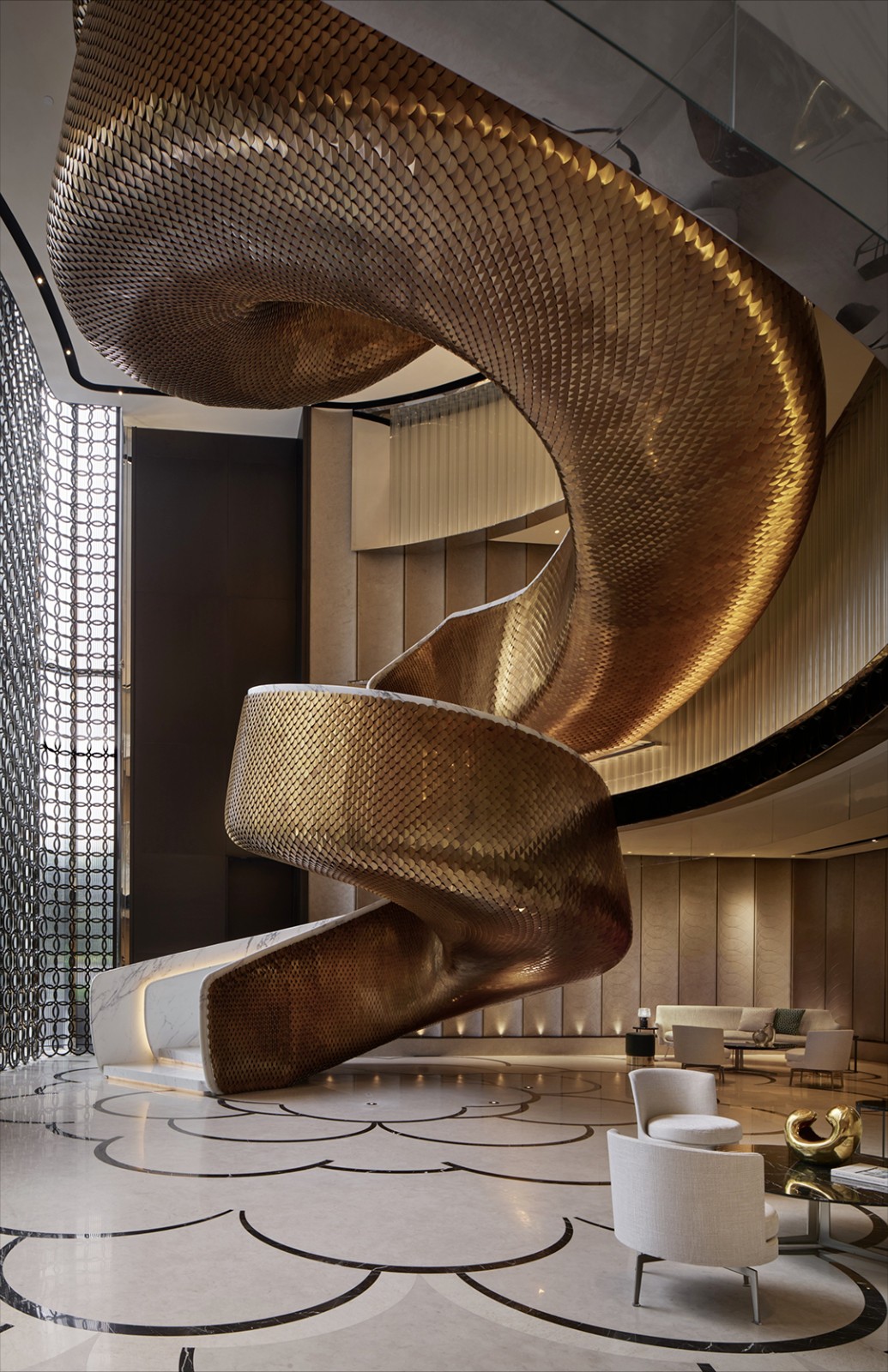 简单的几何形式被用来创建结构在两个楼层。在一层,两个带有彩色铝镶嵌的半圆形金属屏幕在开放的线性空间中为衣服提供了悬挂的栏杆。 在较低的地面上,建筑师使用倾斜的墙壁和柱子来形成一个三角形的地板空间,周围是较小的角落和凹室,比如一个有彩色大理石座椅和鞋架的区域。两个楼梯在整个室内创造了一个有趣的环形通道。