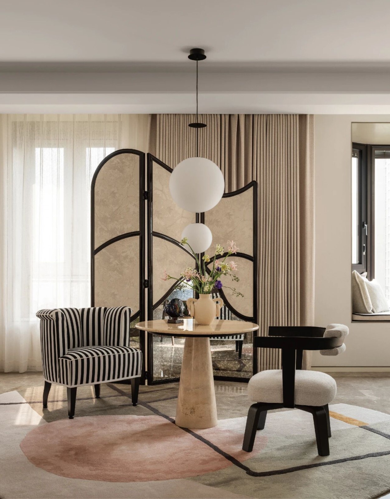 通过定制的石材,生活空间散发出复杂的气息,家具如帕特里夏 · 乌奎奥拉为 Moroso 设计的玫瑰粉色雷东多扶手椅,更加突出了这一点。