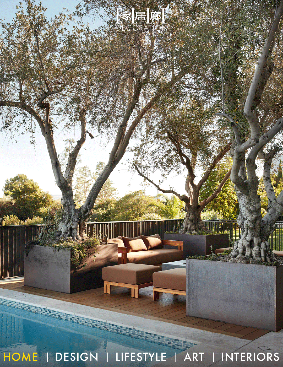 窗外怡人的景致环抱着蓝色的露天水池,水池一侧设有休息区,一台火炉,两排沙发,陪伴着家人度过夏夜与春秋。