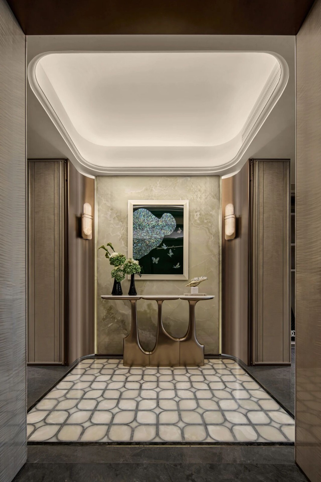 这是一个位于东京市中心的110平的日籍华侨的家,整个平层业主要求不做厨房的设计,但要具有艺术性。 设计师在设计时,采用了“画廊”的动线原里,从入户玄关进门起,就像进入了一个艺术空间。 但为了考虑到家的温暖性,室内的灯光设计以暖色为主,也没有采用瓷砖等元素,走廊回旋处步步生景,颇有中式意味。 卧室大面积的竖条纹采光对中式的井字格做了简化处理,床头的中式宫灯、圈椅都颇具中式韵味。