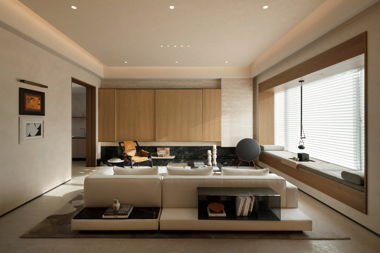 ▲以立柱所在过道为界限,另一侧设计师定制了木质多功能体块,一整面的置物架可以摆放大量的书籍,也为这个跳脱的空间,带来了一些宁静的书香之气。