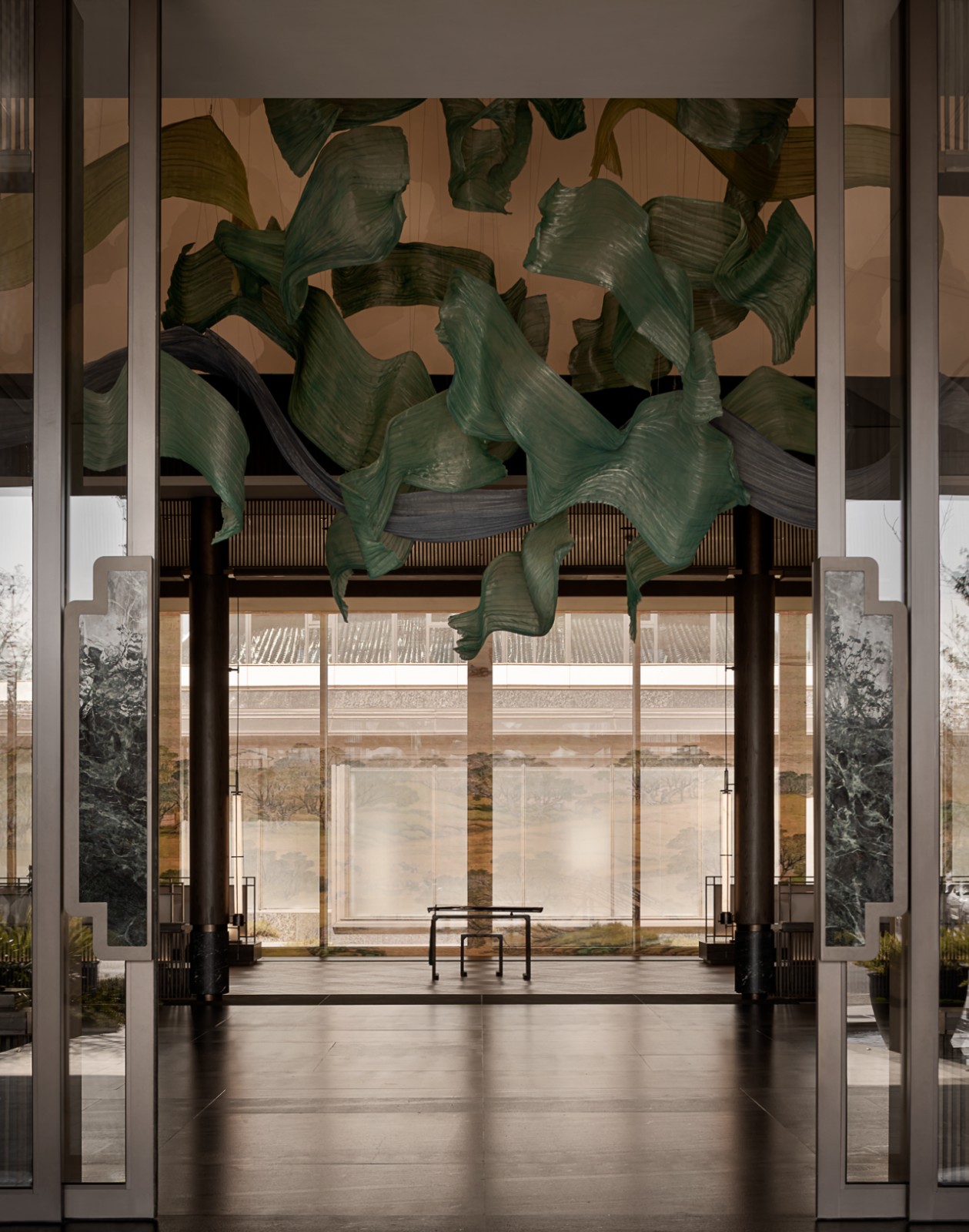 镜面反射扩充空间的广度,以不同的角度进行视觉延伸与引导。地面材质斜面分割,保留、细化上方的玄关梁体,同时联结与屋顶三维结构之间的关系。放置一张年岁久远的原木换鞋凳,支撑起新与旧的回忆对话。仿佛在转瞬之间,便可实现现实与回忆的交融。