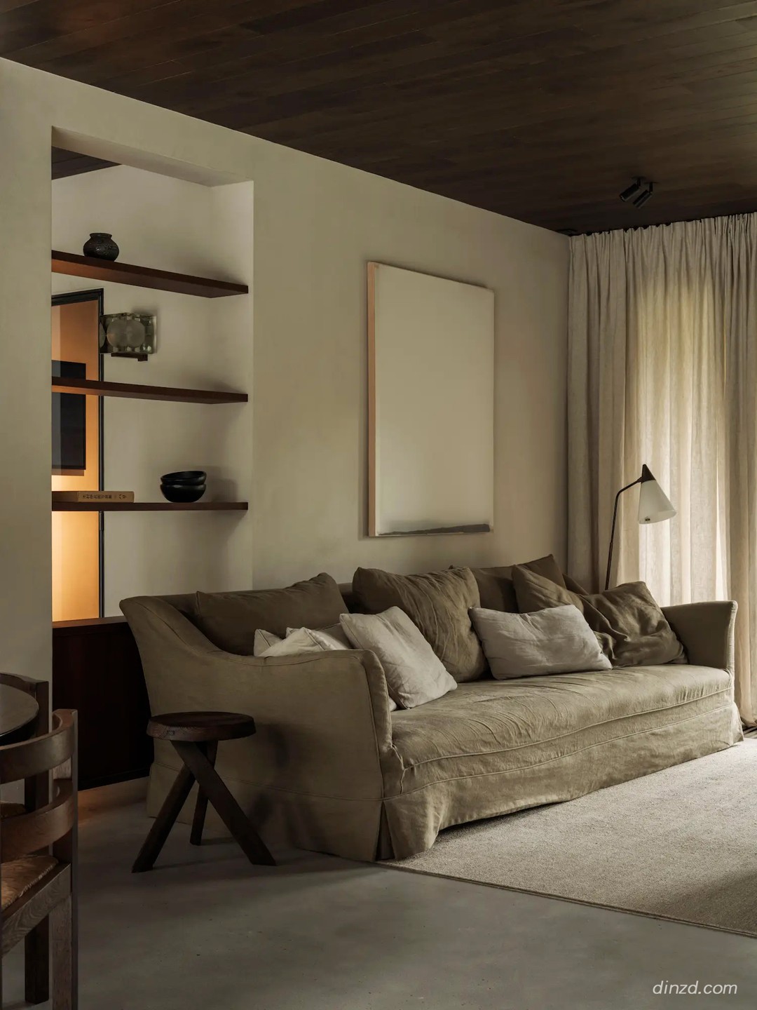 该项目使用了多种技术来“抬高”低矮的天花板——从专注于中层光而不是天花板灯,到家具采用细而轻的腿,使其看起来漂浮在地板表面之上。地板本身很暗,这也在视觉上增加了天花板的高度。
