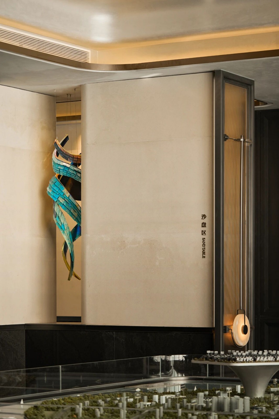 最后,加工所剩的石材废料全部打磨成粉末,与墙面腻子一起合成空间所专属的肌理涂料,用于2.4米以上的墙面及天花区域。