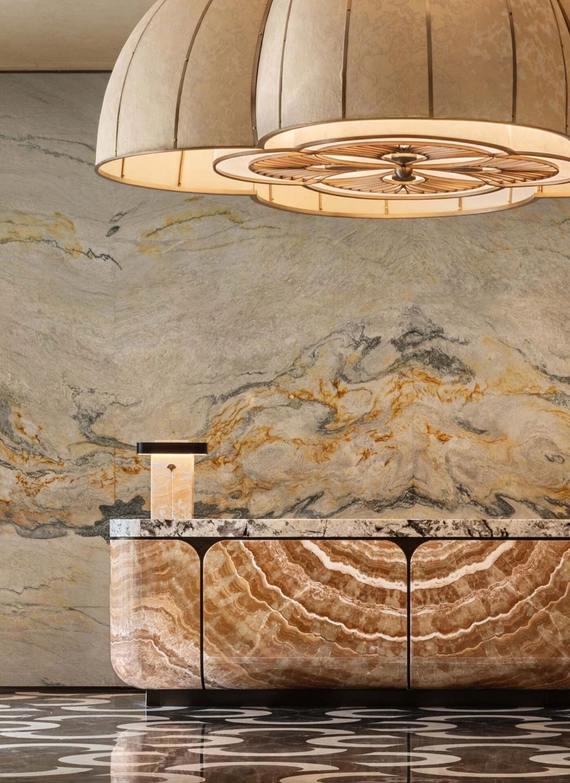 地面石材光看拼花就知道造价不菲、耗材率极高。
