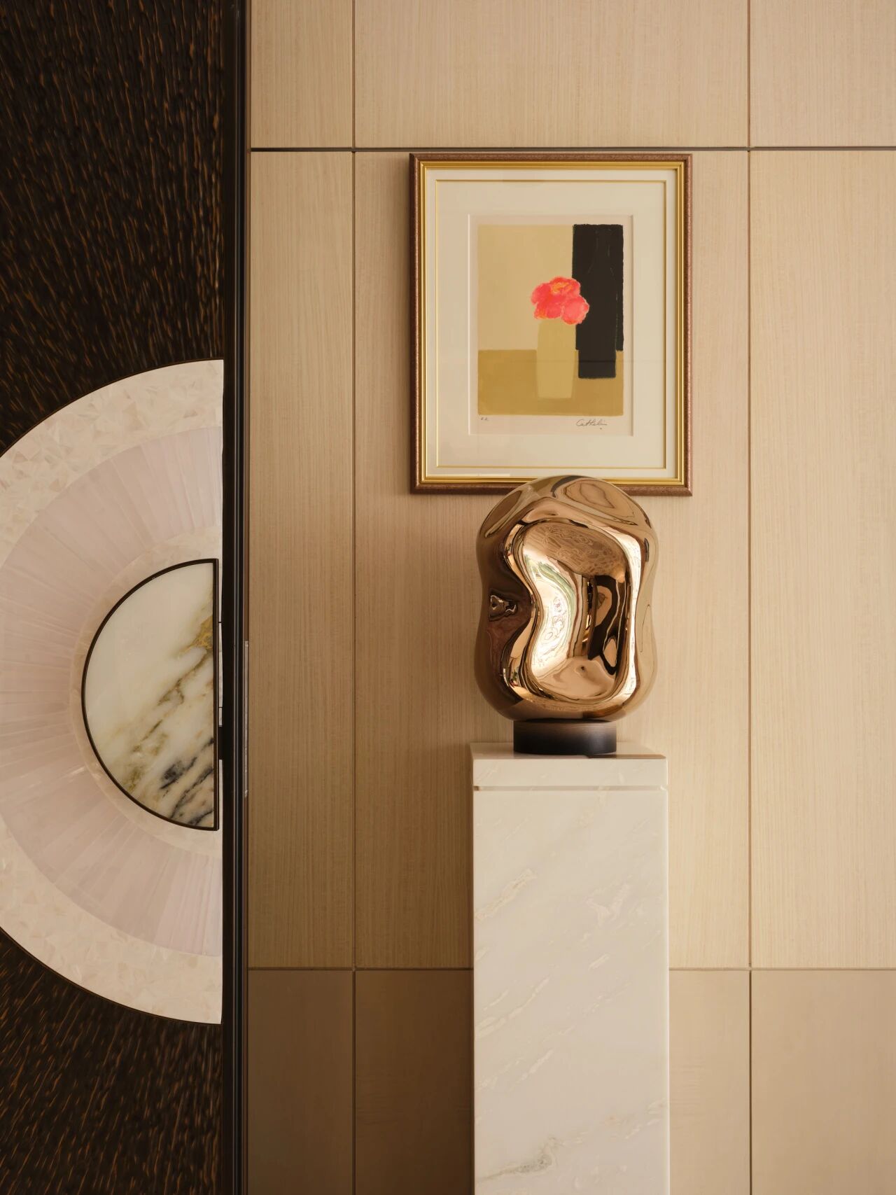 宴会区中心是极具张力的洞石不规则圆桌与黑色长桌的组合,框架与线条均匀流畅,艺术挂画的色彩也来源于天然洞石,在空间秩序平衡下增添了可被感知的“弧度”。