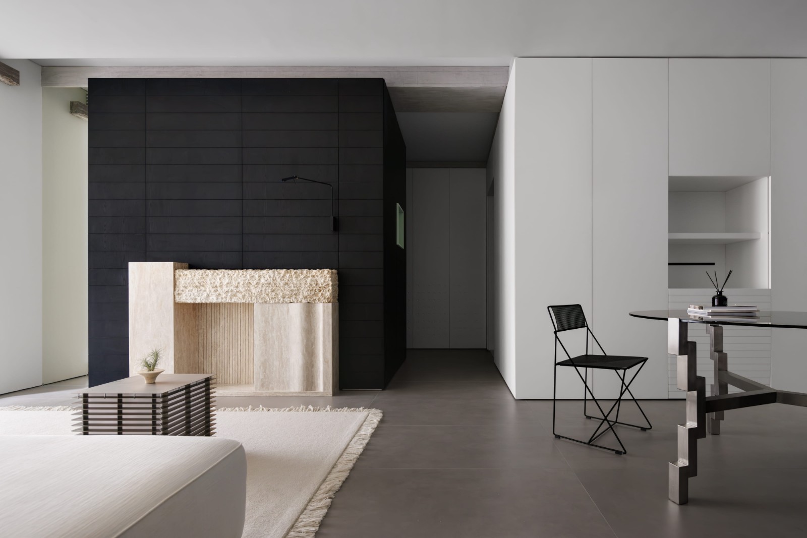 客厅与餐厅之间打破界限,空间尺度被无限虚化,流畅的视觉纵深赋予舒敞的居住体验。微水泥材质与融入墙面与吊顶设计之中,底色温和肌理细腻,立体维度的统一化让空间更显纯粹。 餐厅: