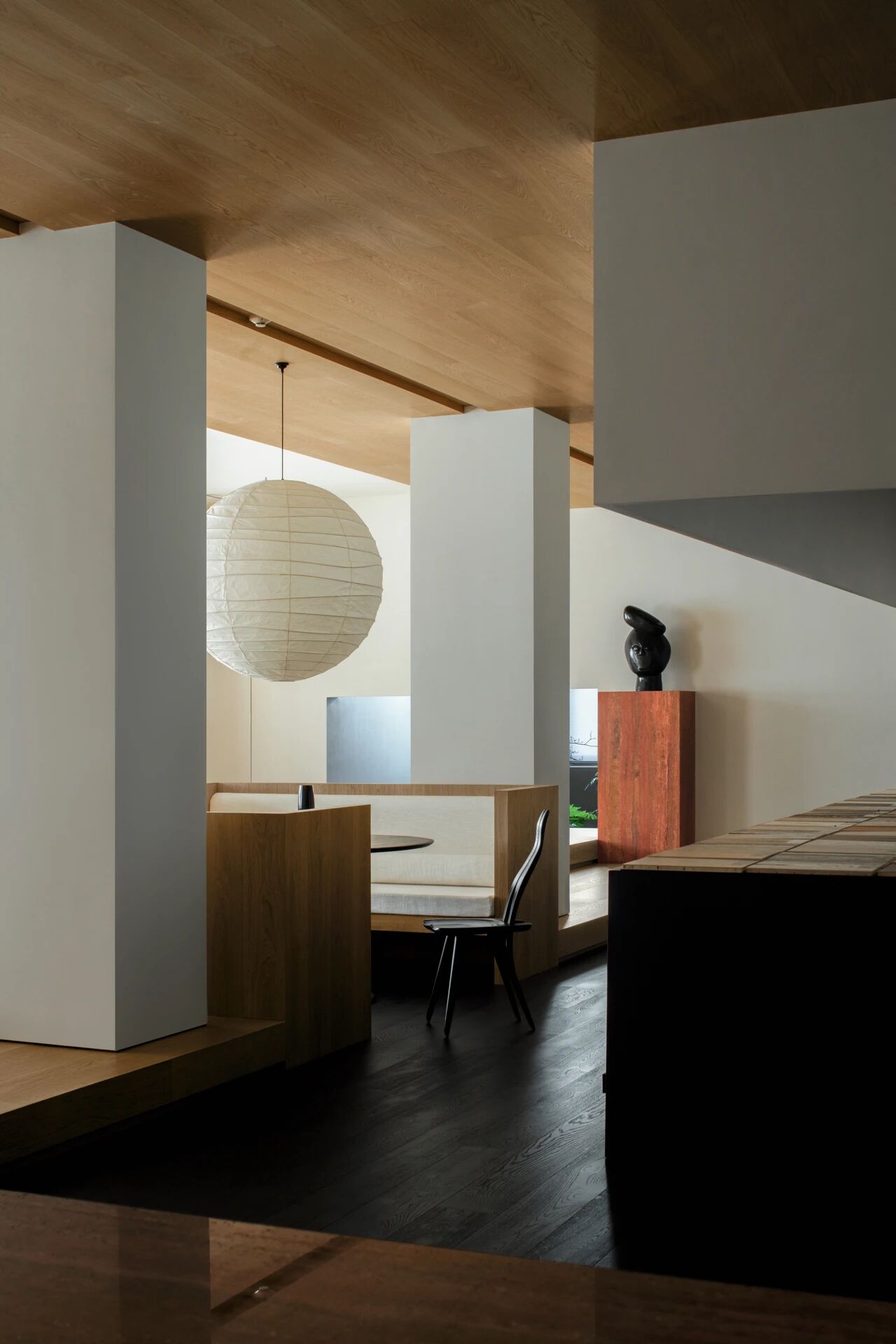 新建的核心空间覆以橡木饰面板。地面采用整体浇筑的水磨石,与地暖系统一体化处理。床头板及其他家具元素同样选用橡木饰面。