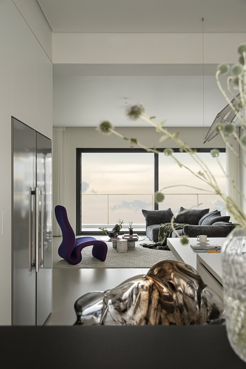 室内空间以 “光影与留白的叙事” 展开。挑高 6 米的中庭是空间的 “呼吸中枢”,顶部的玻璃天窗让自然光肆意洒落,光线穿过悬挂的木质格栅,在浅米色微水泥地面上投下细碎的阴影,随太阳移动缓缓流转,像老寺庙里透过窗棂的光斑。地面没有多余装饰,仅在中庭角落摆放着一方浅灰色石材矮凳,凳面打磨得光滑温润,访客坐下时,视线能毫无阻碍地望向天窗,感受光影的变化;墙面以米白色硅藻泥为主,仅在局部用深棕色实木线条勾勒出简洁的几何轮廓,线条的利落感平衡了硅藻泥的柔和,形成 “刚柔并济” 的视觉节奏。