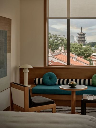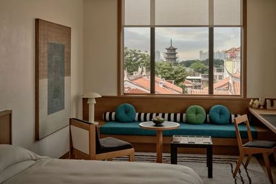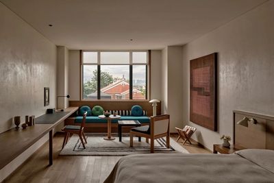 室内色彩源自泉州传统寺庙与民居的色调——琉璃蓝、碧绿、砖红被引入不同客房,分别作为主题色出现,与窗外的城市色谱相互呼应。