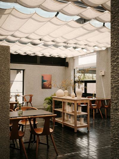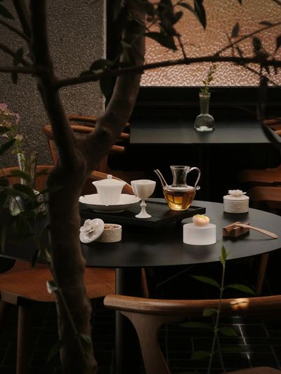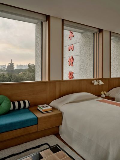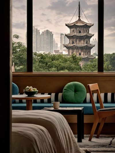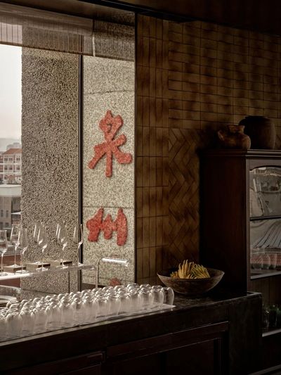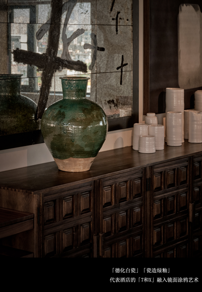 酒店建筑、室内、艺术、家具、摆件 ... 甚至音乐与植物,无不出自精心设计。除了以泉州的非遗手工艺品之外,还与诸多国内年轻新锐设计团队共创。客房内使用的粉引器皿,则来自新锐设计师品牌 studio KAE。小众美学品牌 place (in) place 定制的香皂托盘、RUOHAN Official 定制的工作制服,国内先锋香氛品牌闻献 DOCUMENTS 打造的香氛。