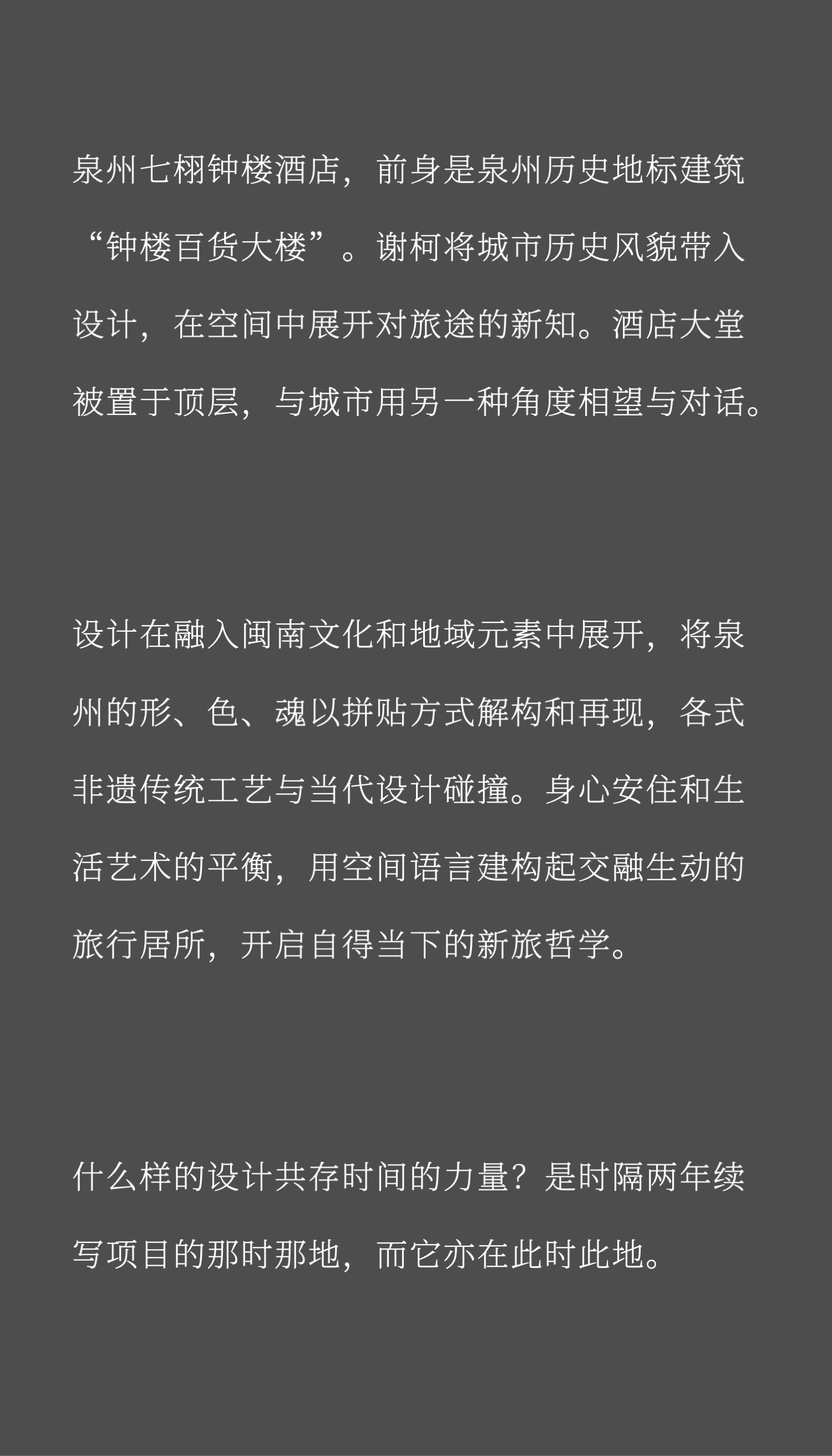 “当你身抵古城的制高点,入眼是泉州的沧桑暮景与风华正茂,前邻地标钟楼,坐望东西双塔,进入七栩也便进入自我与城市的全新连接。”谢柯说。