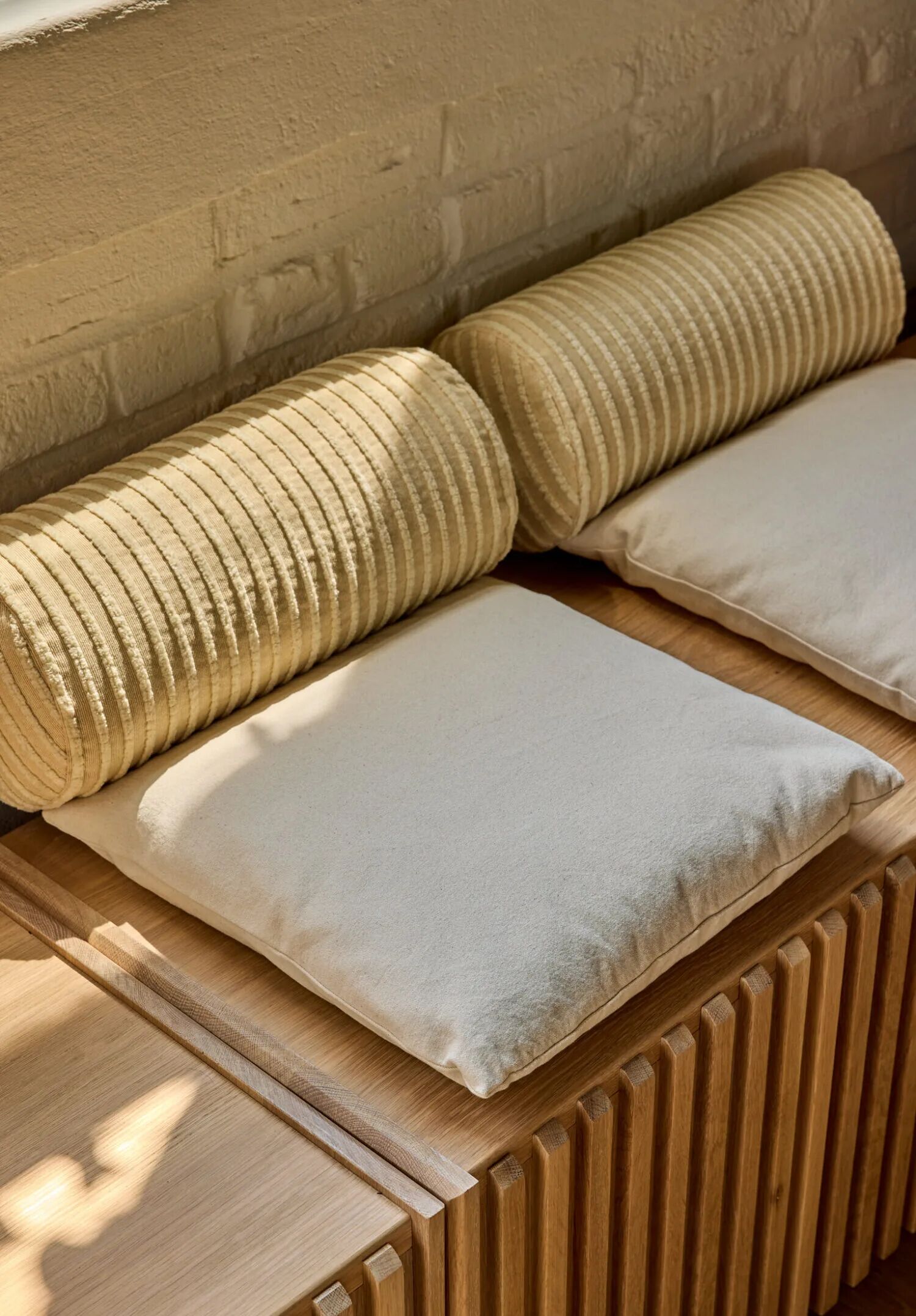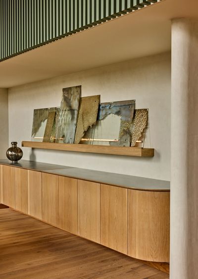 沿着二楼走廊的全高屏风墙既是空间分隔线,也是设计焦点。“屏风的垂直板条整体看去如同一个厚重的体量,将公共区域与私人区域分隔开来,同时将视线向上引导。板条之间的开口在相邻表面上投射出不断变化的光影效果,” 维洛塞特解释道。