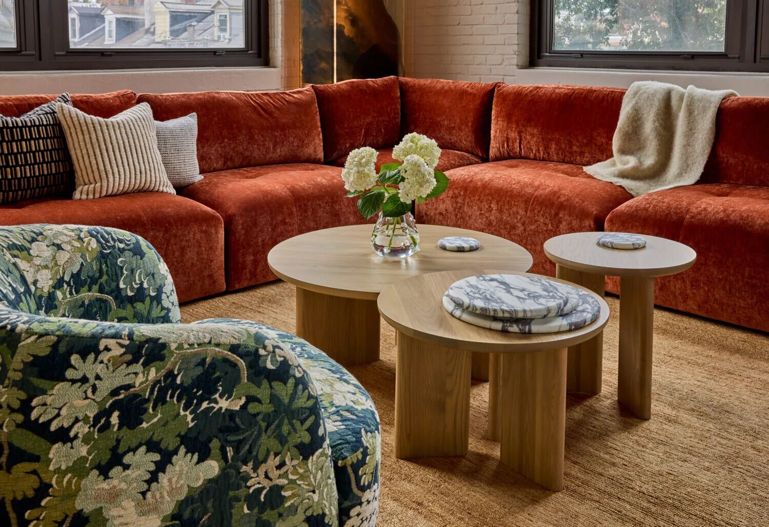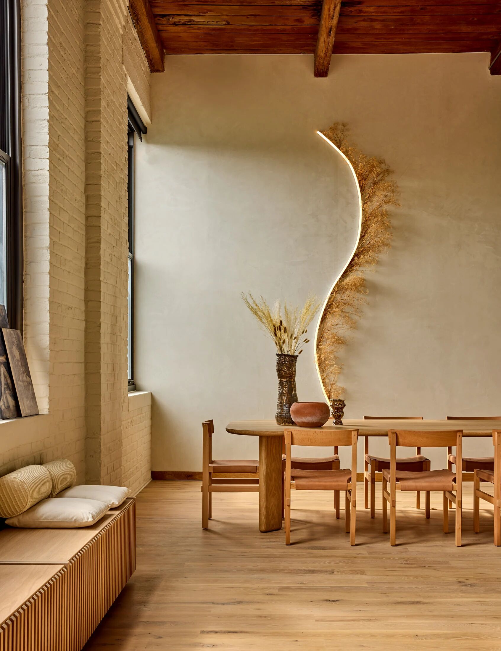原本的砖砌周墙保持裸露状态,被漆成暖白色,作为新铺设的橡木地板、定制木制品以及石膏和石材表面的背景。木材、皮革材质的软垫家具在古铜色的工厂原始饰面衬托下,营造出高雅而休闲的氛围。该项目充分展现了费城的工艺水准 —— 从 Design Build Adventure Club 的托德・夸尔斯定制的橡木餐桌,到 Velocette Studio 与 Argent Mirror 合作制作的水彩镜子,皆体现匠心。