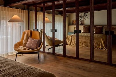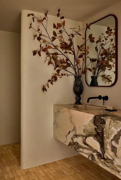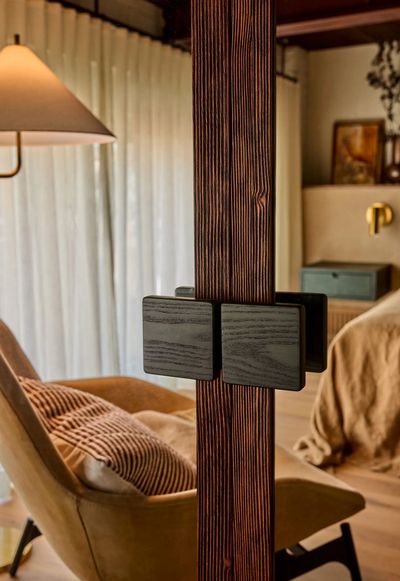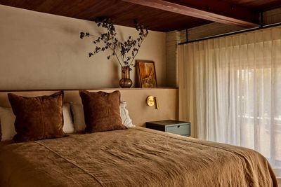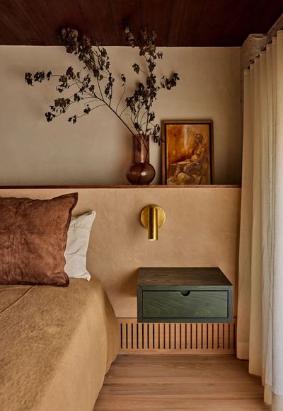 主套房打造出充满阳刚气息的休憩空间,拥有低矮的深色天花板和赤土风格的石膏墙,这面墙既可用作床头板,也可作为照明展示架。毗邻的浴室铺设着黑色与天然色调的水磨石地板,搭配黄铜装饰和火山石灰岩浸泡浴缸。