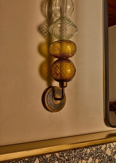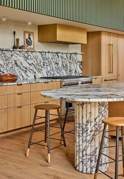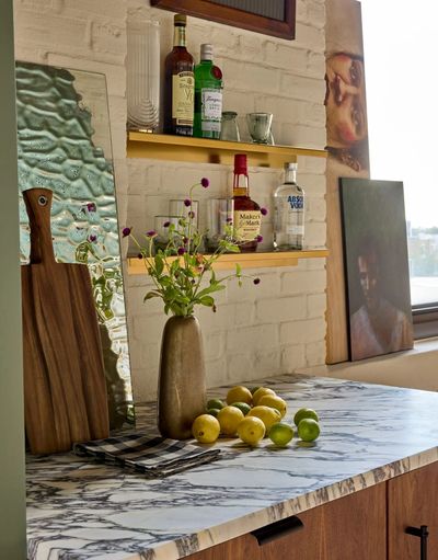 厨房是唯一一个从 4.9 m高的天花板垂下灯光的区域,带有实心黄铜五金件和加尔各答中提琴大理石台面的定制细木工制品,在此营造出视觉焦点。