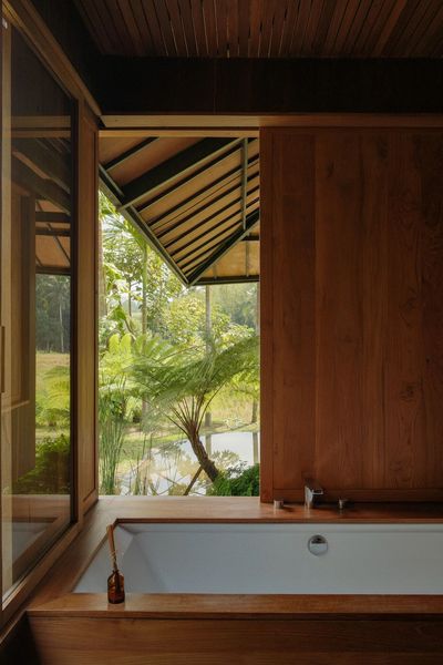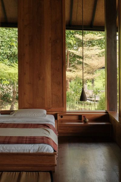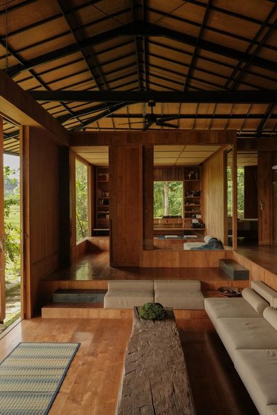 屋顶的双坡藏着光的密码:微妙的非对称设计,让晨昏光线斜穿入室,在柚木地板上流淌暖金,却将正午烈日柔化过滤。远望时屋檐折线与稻田缓坡平行延展,仿佛大地自身的褶皱。
