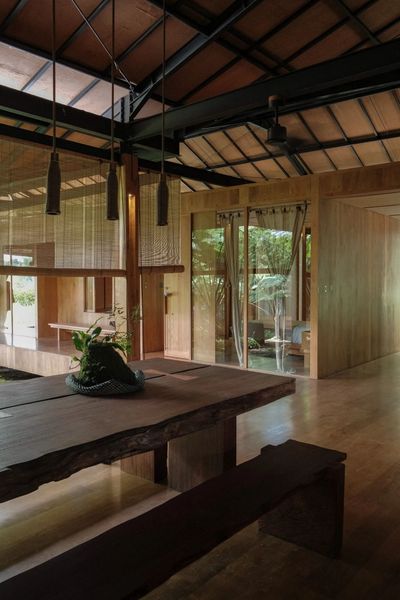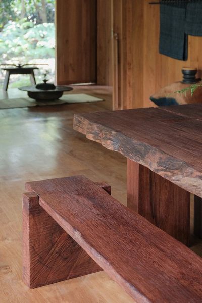 Avalon 的手停在餐厅长桌的裂痕上——闪电状纹路贯穿柚木,蝴蝶榫如银针将断纹缝合。"印尼语中永恒与柚木同词,"他的指尖轻触凸起的木榫,"因为它经得起时间考验。我们接受木材开裂、变色、变形,这些不是缺陷,是材料在诉说故事。"这枚伤痕勋章被复刻至全屋:长凳的斜接榫、柱头的隐藏关节,成为空间的灵魂印记。