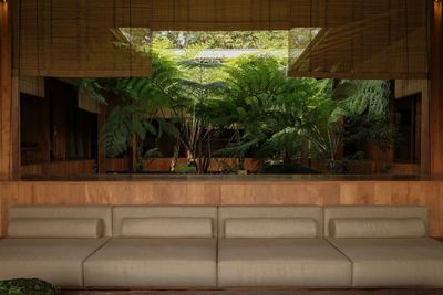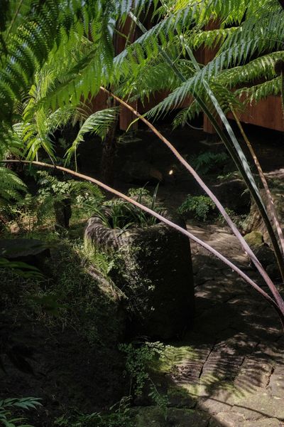颠覆性的营造逻辑就此展开:屋顶如巨伞撑开四年,雨水在檐下织成珠帘。Sebastian 在空地上播下来自河床的野生树苗,任其在疫情停工期间自由生长。复工时,火山石庭院中已探出发光的蕨叶,枝条缠绕成天然隔断。"房间布局和开窗位置由绿植长势决定," Conchita 指向客厅,"那株当年的幼苗,如今成了取景框。"