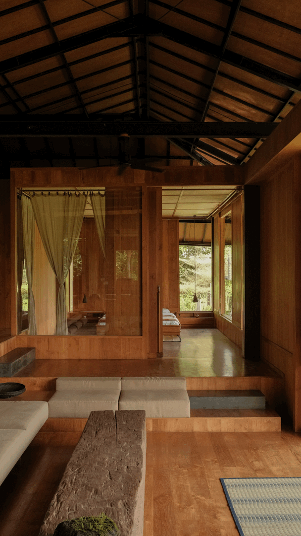The dual-pitched roof held a secret code of light: a subtly asymmetrical design allowed the oblique rays of dawn and dusk to pour indoors, warming the teak floors with golden hues, while filtering and softening the harsh midday sun. From a distance, the folded eaves extended parallel to the gentle slopes of the rice fields, like natural folds in the land itself.