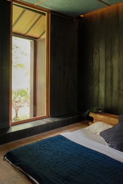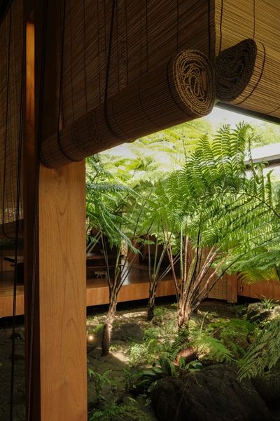 A groundbreaking construction logic unfolded: the roof stood like a giant umbrella for four years, rain weaving beaded curtains along its eaves. Sebastian sowed wild saplings from the riverbed across the open ground, allowing them to grow freely during the pandemic-induced construction pause. By the time work resumed, luminous ferns had emerged in the volcanic stone courtyard, and branches had woven themselves into natural partitions. “The room layouts and window placements were determined by the growth of the greenery,” Conchita explained, pointing to the living room. “That sapling from back then has now become a living picture frame.”