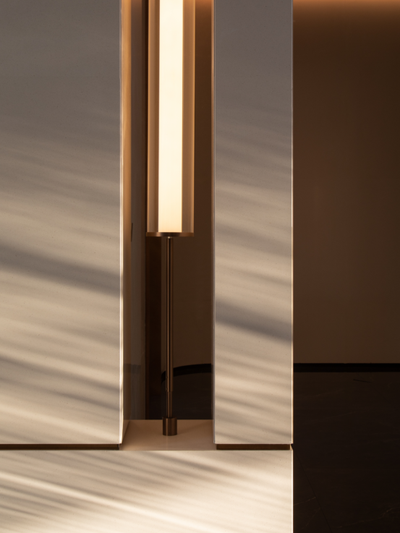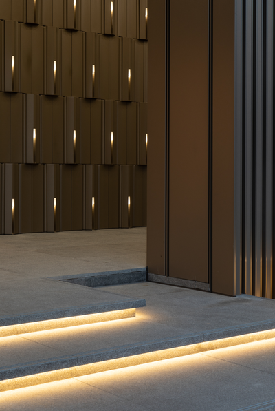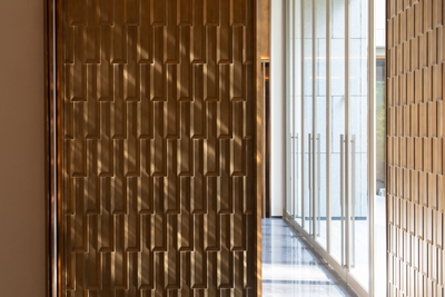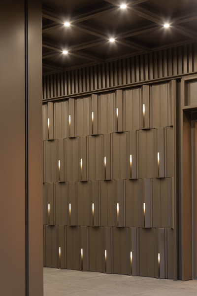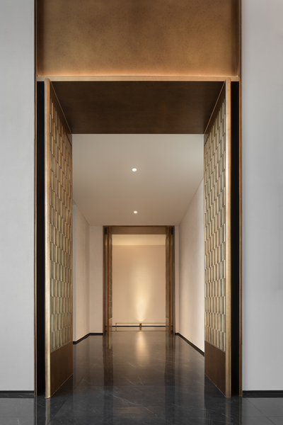 入口内部,我们巧妙运用阵列手法,嵌入式灯组柔和铺陈,与墙面金属质感的阵列式装饰,既凸显空间的精致格调,又借由暖光与材质的互动,传递出温润且富有质感的氛围。