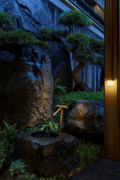 入口两侧对称的绿植造景、雾气萦绕的景观小品,消弭了建筑与自然的边界,使入口仿佛从自然中生长而出,营造出独特的自然意趣与雅致氛围,增强入口的独特性与吸引力。