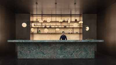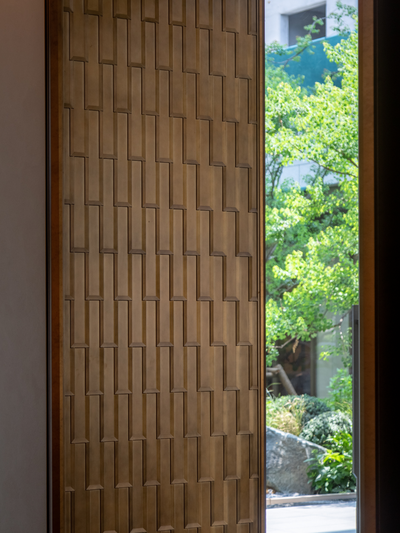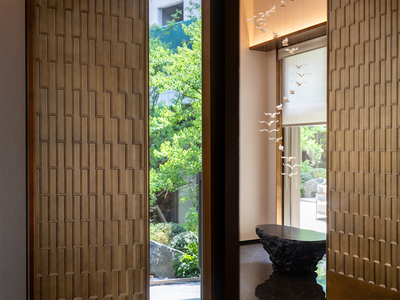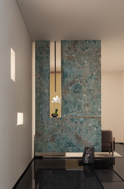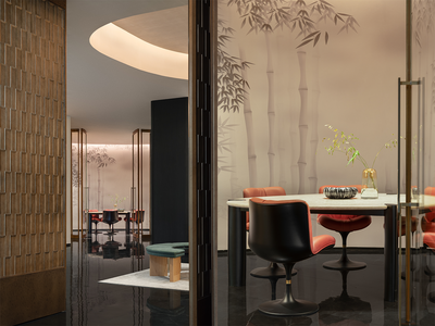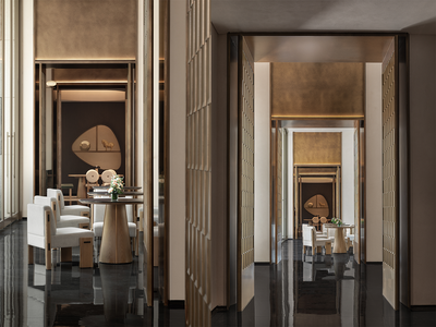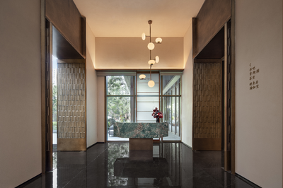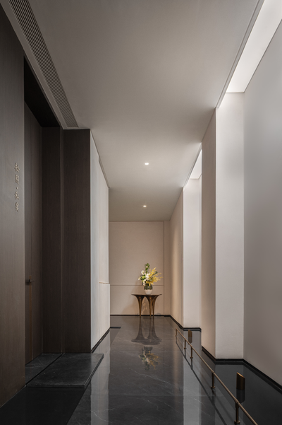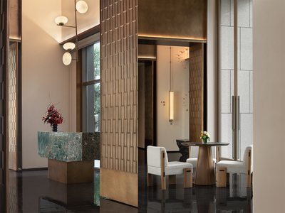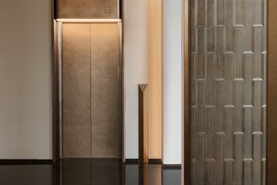 负一层电梯厅以简素为底,深色地面沉稳,墙面线条利落。金属格栅门呼应传统形制,天然奢石接待台与球形吊灯对话,通透玻璃引景入室,将自然意趣与东方美学相融,营造静谧而具张力的归家序章,彰显共向对空间营造的匠心。