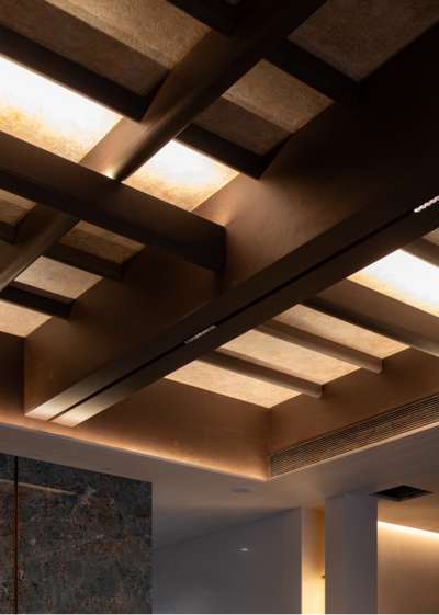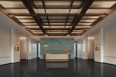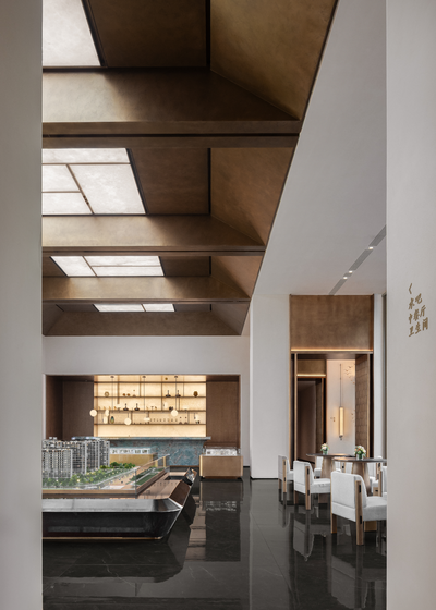 一层接待厅室内天花板用多种现代材质表达传统中式建筑的梁架结构,顶面格栅交错,借光影铺展层次韵律;墙面以素白为底,以各式线条对立面轻点分割,漾出雅致意趣。深色石材地面沉稳承托,整体于庄重典雅中糅入现代质感,尽显高端精致。