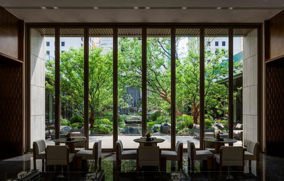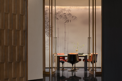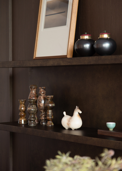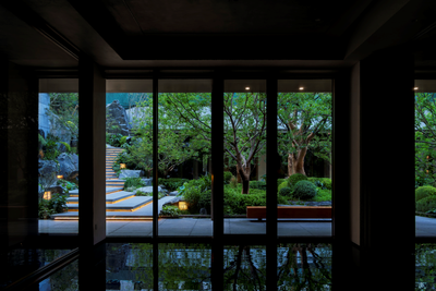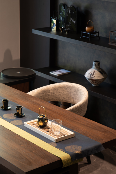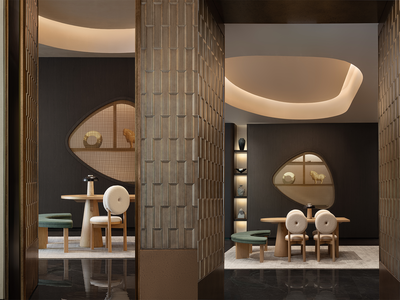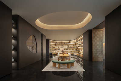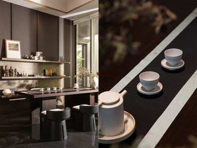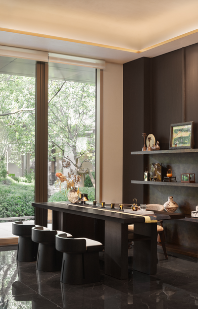 这间茶室以 “借景入园,以器载道” 为核心,大面积落地窗引园林绿意成流动背景,消解室内外边界。茶室用深色实木与温润石材碰撞,既有东方禅意的沉静,又不失现代设计的利落。