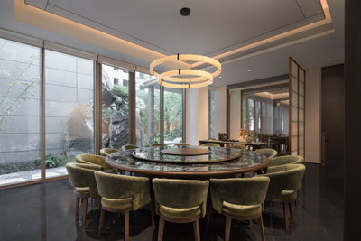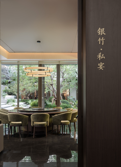 私宴包厢借大面积落地窗,将园林景致如画卷般引入室内,雅致吊灯柔光洒落,搭配质感上乘的座椅,营造出自然意趣与奢华格调交融的高端用餐氛围。