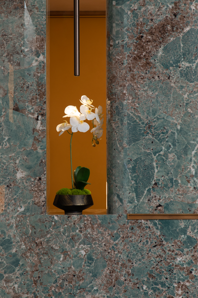落客光厅用简洁几何线条与线性光源,营造通透有序氛围,转角亚马逊绿奢石配风铃花花艺成视觉焦点;花香中庭借线性模拟天窗引入自然光,花艺绿植柔化空间,让访客一入内便被自然艺术交融的诗意包裹。