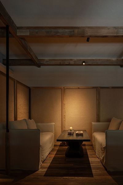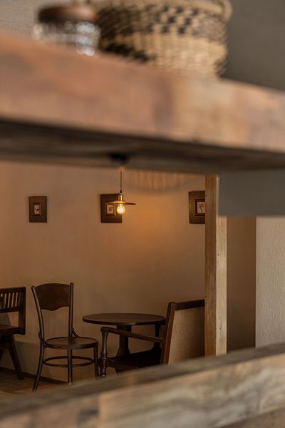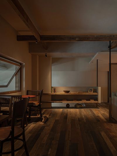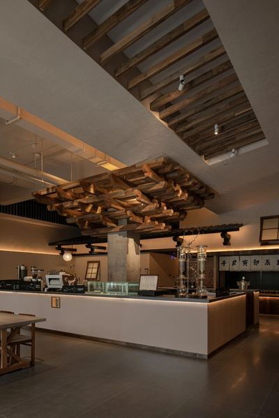 Upon entering, ones gaze naturally lifts upward. Layered bamboo grilles, suspended from the ceiling, cast shadows like the marks of time as diners look up while enjoying their cold treats. Arranged at precise intervals, sunlight or artificial light penetrates them, being cut and sifted into moving dappled light and soft shadow lines that silently drift and shift across the floor, tables, and walls.