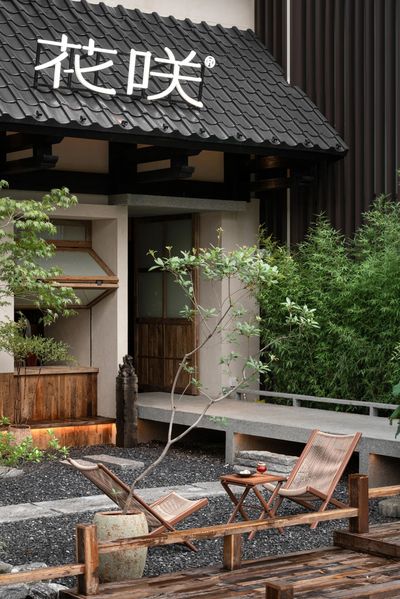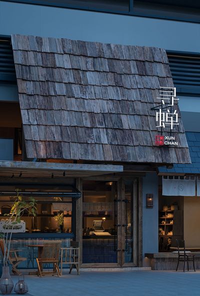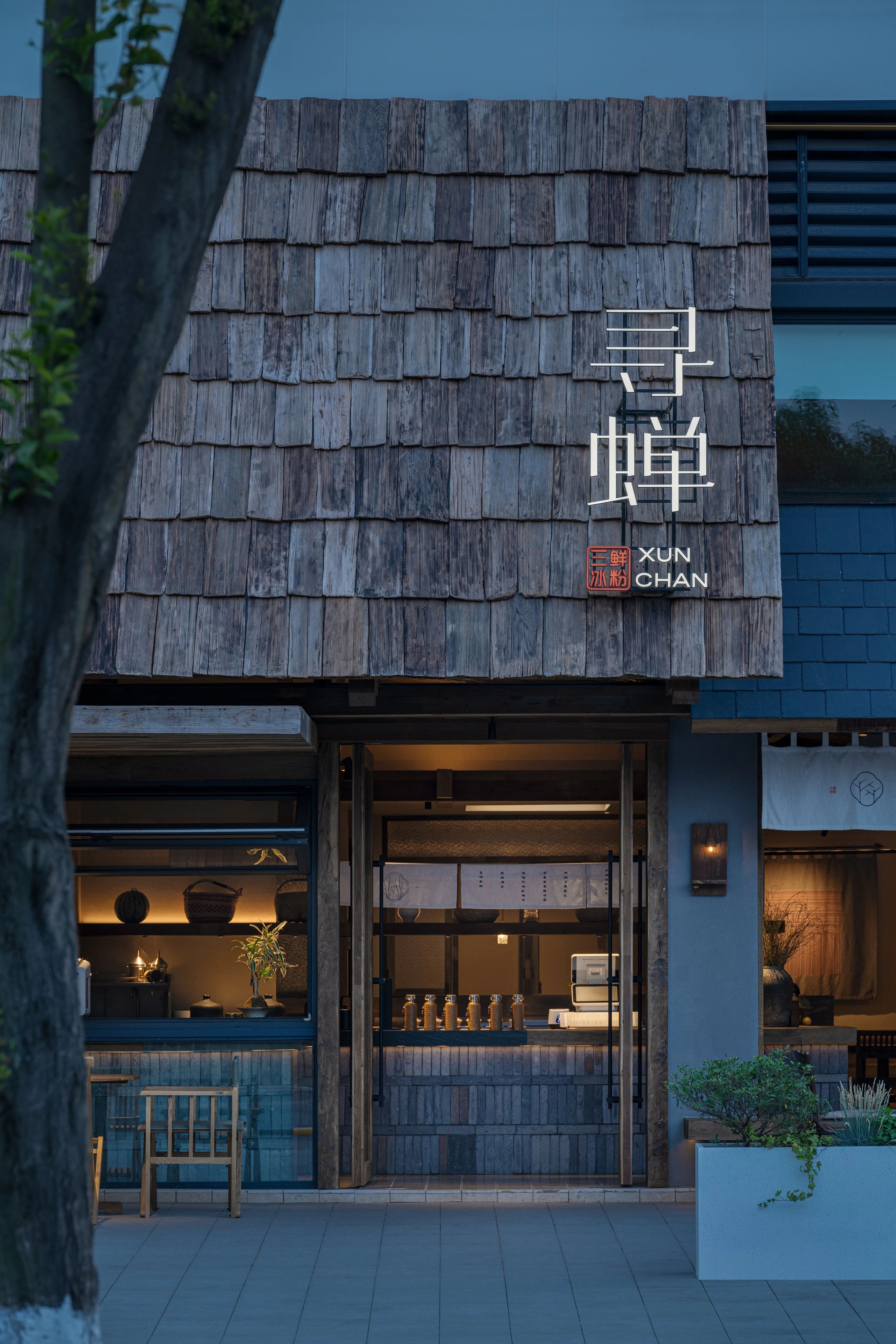 IThe deeply protruding flying eaves blur the boundary between inside and outside, creating an open "liminal space." Here, children dodge sudden summer showers, elders sit leaning against the wall chatting, delivery riders pause to wipe their brows... It is no longer just a commercial entrance but a public refuge on the street corner. The wooden plaque bearing the gentle, whispering charac- ters"寻蝉"(Xun Chan) is subtle, yet what truly speaks is the vibrant, flowing life of the community continually unfolding beneath these eaves.ood.
