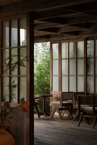 Bamboo shadows and well-spaced emptiness bring visual sereni- ty, wooden tables and chairs offer a warm touch, and a refreshing taste awakens the senses--together, they weave a pastoral urban dream, offering an escape from the summer heat.