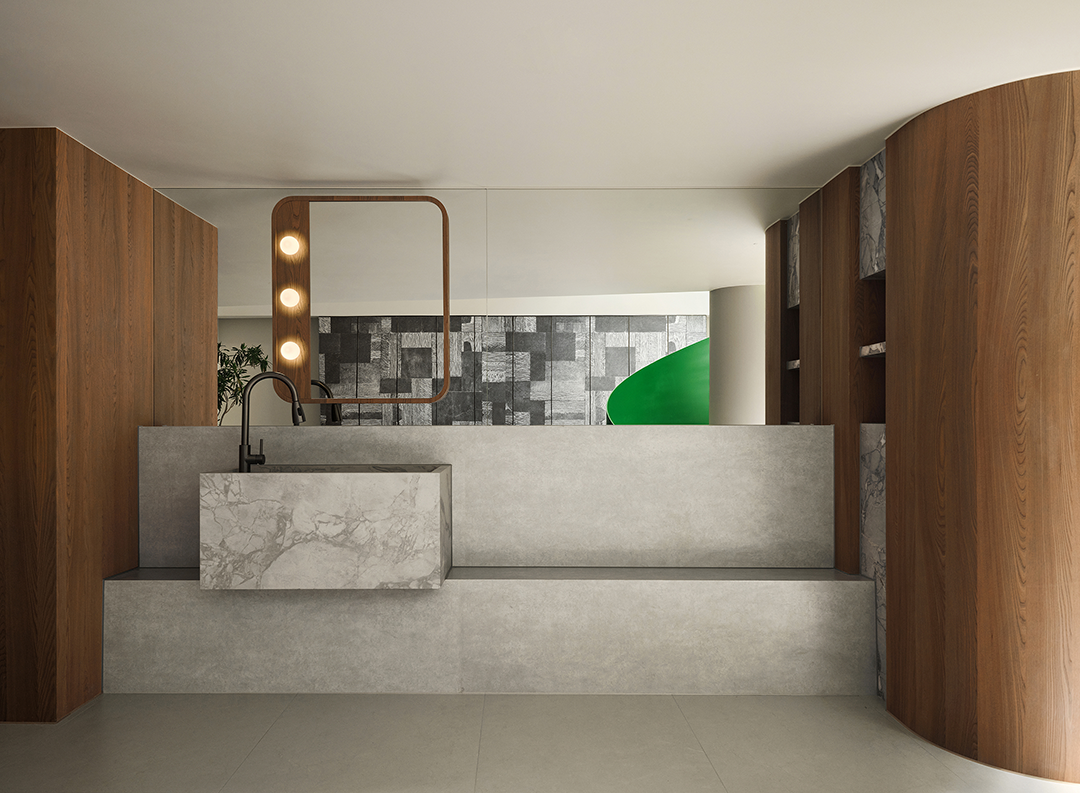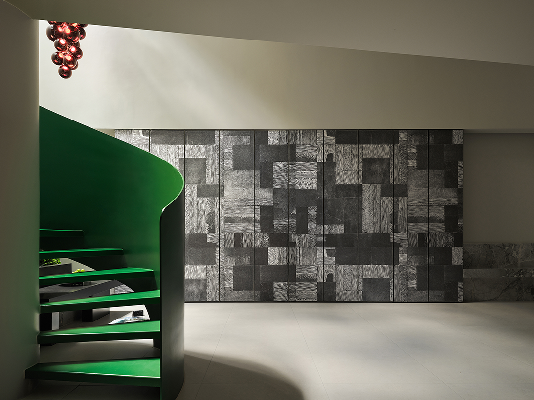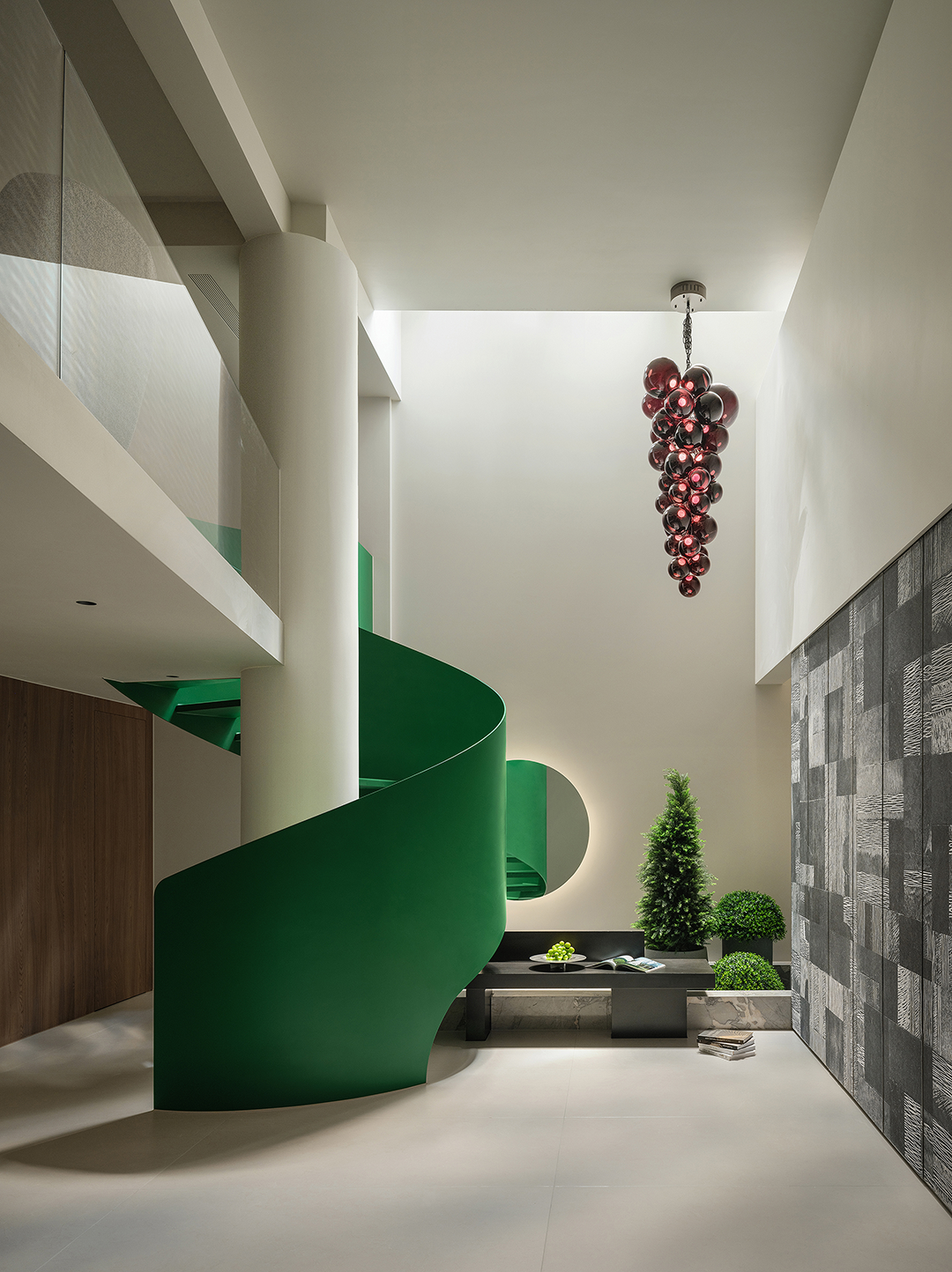 那抹浓郁的绿色螺旋楼梯如空间的艺术雕塑,以流畅的曲线打破建筑的直角秩序,将功能性的交通空间转化为视觉焦点与艺术载体。