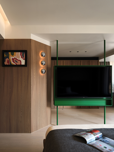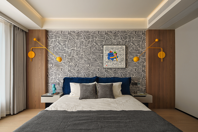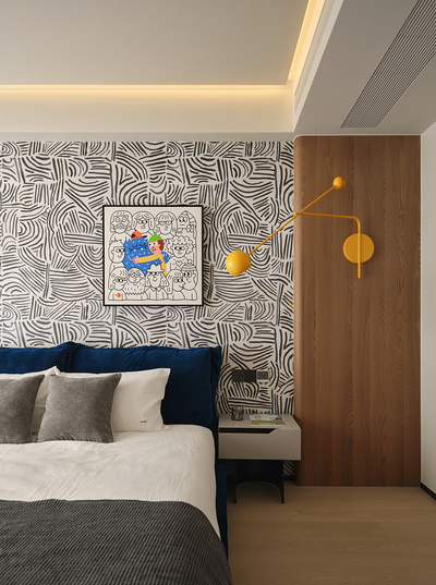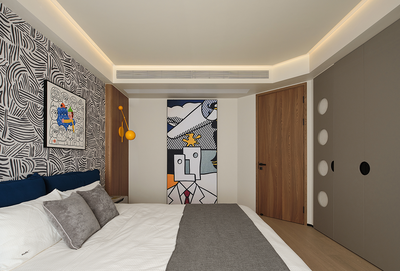 儿童房以抽象线条壁纸为视觉基底,波普风格艺术画则以夸张的色彩和结构主义形式,形成视觉冲突与对话,让睡眠空间成为沉浸式艺术体验的延伸。