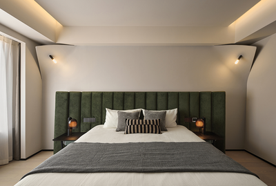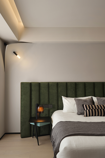 主卧背景墙的弧形线条与壁灯结合,弱化硬朗的边界,营造柔和的休憩氛围。