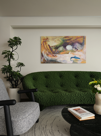 以墨绿色沙发为视觉核心,其浓郁色彩与独特纹理,既彰显自然生机,又自带艺术张力