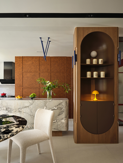 开放式布局让餐厨、起居空间自然串联,定制木柜的弧形设计柔化了空间边界,既实现了功能的高效整合,又营造出