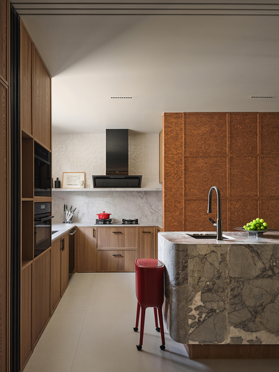 大理石中岛台凭借其独特的纹理与冷冽质感,成为空间的视觉核心,既满足实用功能,又为空间注入轻奢精致感。