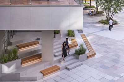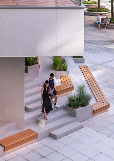 “邀约”,邀请人们停留、坐下,并自然地引导视线与脚步向上探索。家长们可以惬意地坐在这里,视线毫无遮挡地照看在喷泉中嬉戏的孩子,解决了公共空间中的一个具体痛点。
