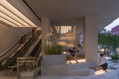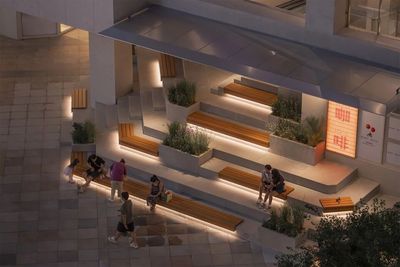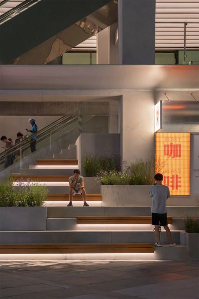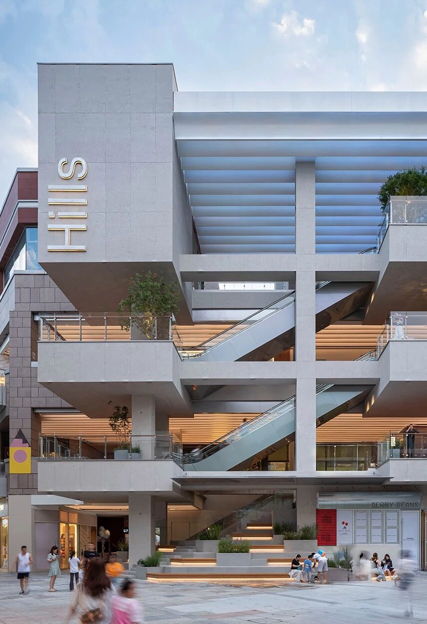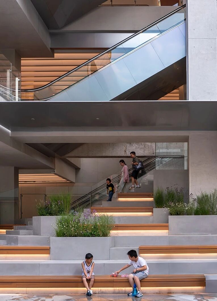”城市看台”,吸引着人们在此停留、聚集并向上探索,孩子们的欢笑声与家长们闲适的身影交织在一起,充满了生活气息。二层及三层的”打卡平台”因功能雨棚的加入而更具活力,人们愿意在栏板边的吧台小坐,喝杯咖啡,俯瞰广场上的热闹景象。这些停留、交谈、观望的人们,本身就构成了最生动的立面表情,吸引着更多地面游客的好奇心。