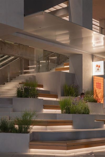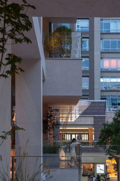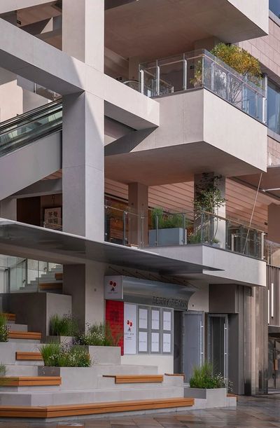 ”花园式”的商业氛围,我们将绿植作为重要的设计元素,贯穿于整个立面。在各层平台精心布置花池和树木,不仅软化了建筑硬朗的线条,更将地面层的自然气息垂直向上延伸,创造出一个多层次的、充满生机的空中花园。