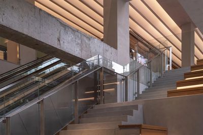 夜幕降临,多层次的灯光系统被激活。统一的顶棚策略在此刻展现出全部魅力:各层走廊的发光吊顶提供了柔和的主照明,与隐藏在扶手下方、平台边缘的线性灯带共同勾勒出建筑的温暖轮廓;而在顶层,弧形格栅在灯光下也呈现出与白天不同的质感,共同为整个建筑加冕。