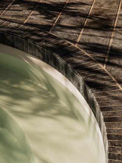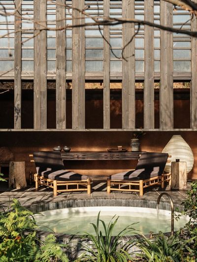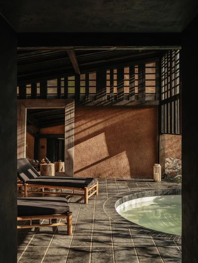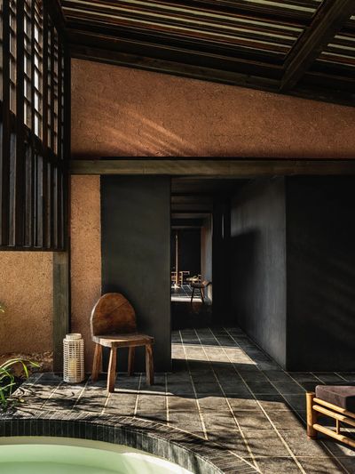 深色调的室内空间,给人一种幽深宁静的氛围感,经由天井洒下的天光指引,进入汤池的那一刻,会深刻体会陶渊明笔下“木欣欣以向荣,泉涓涓而始流”的深义。