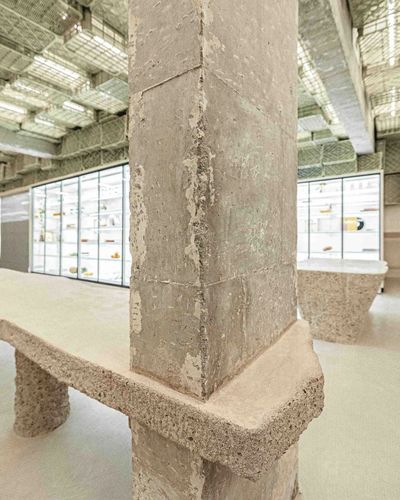 最引人注目的部分是天花板——它由上千个塑料盒组成,这些盒子以模块化的方式排列在一起,且彼此之间的间距都经过精确计算。每个塑料盒都是从工业废塑料中回收再利用的,它们通过独特的纹理结构过滤光线,从而创造出随时间变化而变化的几何阴影效果。