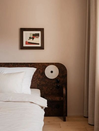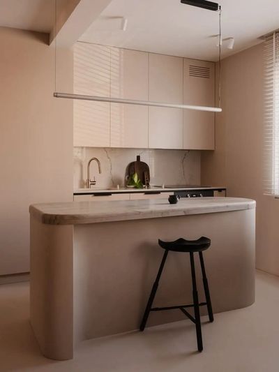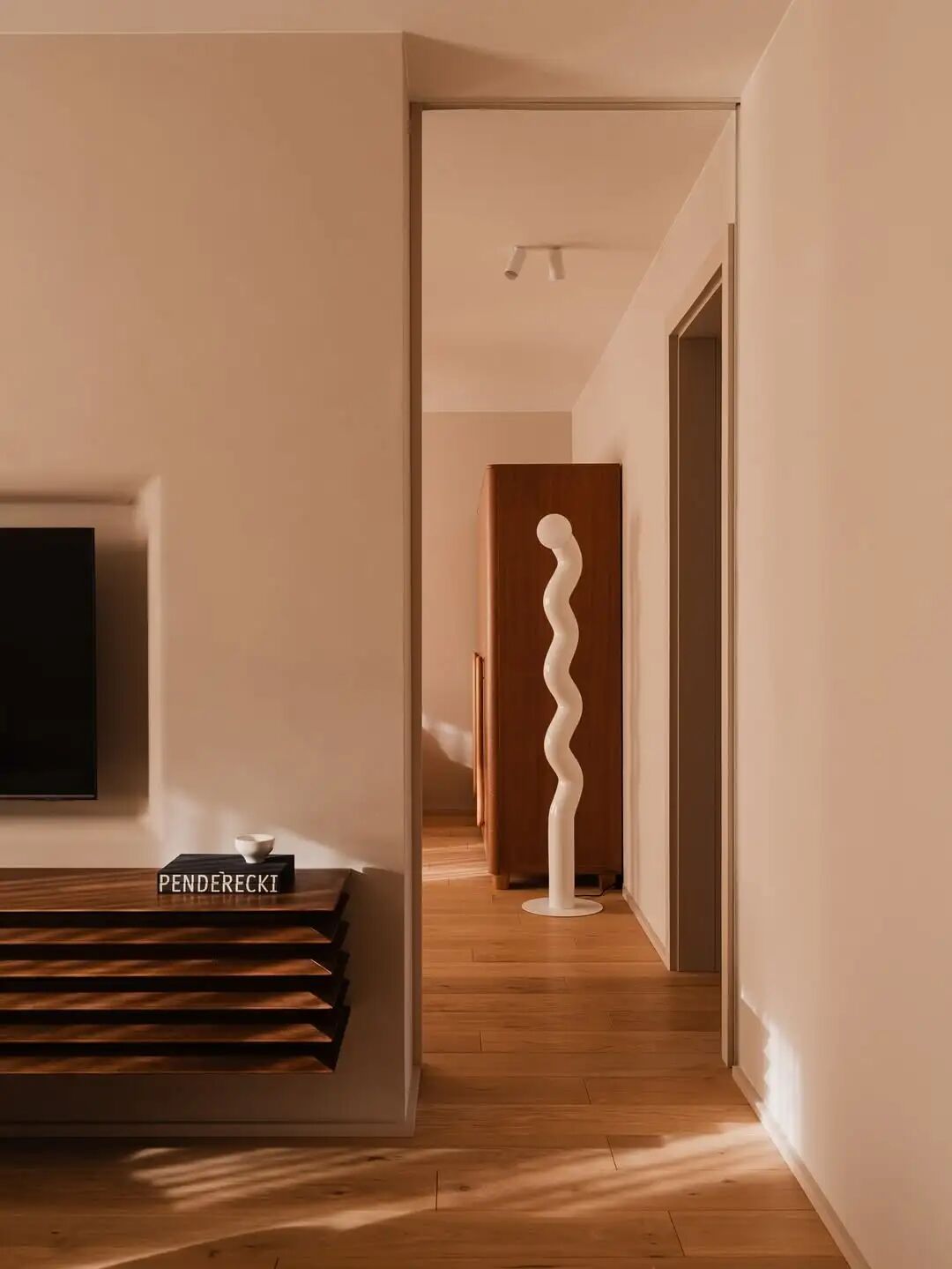 日间活动区的核心是一个弧形不对称中岛台,其明亮的质感与入口处那面修长的深色储物柜形成鲜明对比。此外还设有一间功能灵活的房间,配有通高隐形门,既可用作客厅的延伸区域,也能作为完全独立的空间。